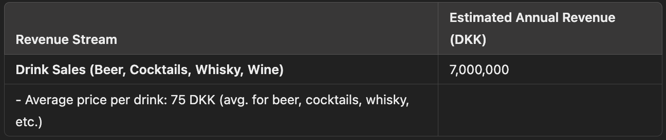 Estimated 250 drinks sold per day, with an average spend of 300 DKK per customer. (5 days/week operation) | 7,000,000 | | Cigar Sales | 1,200,000 | | - Average cigar sale: 150 DKK per cigar